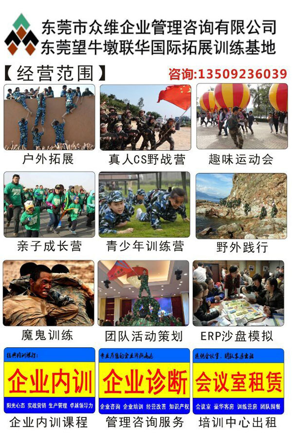 東莞眾維培訓公司旗下眾人拓展培訓部專業提供團隊凝聚力課程、銷售團隊激勵課程、卓越領導力課程等幫助企業團隊增強工作激情和熱情,加強溝通交流能力,執行力拓展訓練,市場突破。試問東莞拓展培訓哪家好,東莞拓展培訓哪家專業,東莞拓展培訓哪家效果好,東莞拓展培訓質量好,找眾人團隊就對了。咨詢0769-86221516,13509236039或QQ3111245898。(東莞拓展訓練-眾維培訓公司網址:m.bjytjywz.com)。